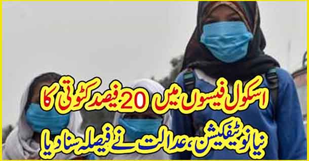 قوانین اور آئین کے خلاف ہیں۔وکلا نے مزید کہا کہ رولز 2005 کے رول 19 کے تحت حکومت صرف موثر اور شفاف ادارہ جاتی انتظام کے لیے ہدایات جاری کرسکتی ہے اور اسے آرڈیننس یا رول کے تحت کسی معاملے میں اسکول کو فیس میں لازمی کٹوتی کا حکم یا ہدایت دینے کا کوئی اختیار نہیں۔انہوں نے کہا کہ یہ ترمیمی عمل امتیازی ہے کیونکہ ایک طرف نجی اسکولوں کو عملے کو 2 ماہ کی پوری تنخواہ دینے کی ہدایت کی گئی اور دوسری جانب اسکول فیس میں 20 فیصد کٹوتی کے احکامات جاری کیے گئے۔وکیل نے کہا کہ یہ عمل معتصبانہ ہے کیونکہ یہ فیصلہ نجی اسکولز ان کی تنظیموں کو سنے بغیر کیا گیا، یہ امتیازی فیصلہ ہے کیونکہ کسی اور شعبے یا کاروباری سیکٹر کو کوورنا وائرس کی وجہ سے آمدن میں لازمی طور پر کمی کی ہدایت نہیں کی گئی تھی۔درخواست گزاروں کے وکلا نے زور دیا کہ اساتذہ کے تقرر اور طلبا کے داخلے سے متعلق معاملات معاہدوں کی شرائط اور ضوابط کے تحت یض جنہیں کسی بھی صورت حکومت کی جانب سے تبدیل نہیں کیا جاسکتا۔عدالتی بینچ کے مطابق درخواست گزار خصوصی حکم کی دو شقوں سے دکھی ہوئے جو اپریل اور مئی کی فیسوں میں 20 فیصد کٹوتی اور پہلے ہی ان مہینوں کی پوری فیس لینے کی صورت میں رقم کی واپسی یا ایڈجسٹمنٹ سے متعلق ہیں۔بعدازاں عدالتی حکم میں کہا گیا کہ فریقین اور ایڈووکیٹ جنرل سندھ کو 14 مئی 2020 کو صبح 11 بجے پیش ہونے کا نوٹس جاری کیا جائے اور آئندہ سماعت تک اعتراض شدہ 28 اپریل 2020 کے خصوصی حکم نامے کی شق (ii) اور (iv) کا آپریشن معطل رہے گا۔یاد رہے کہ کورونا وائرس کے باعث درپیش صورتحال کو مدِ نظر رکھتے ہوئے 7 اپریل کو محکمہ تعلیم سندھ نے ایک نوٹیفکیشن جاری کر کے تمام نجی اسکولوں کو ماہ اپریل اور مئی کی فیسوں میں 20 فیصد کمی کی ہدایت کی تھی۔اعلامیے میں ہدایات کی گئی تھیں کہ صوبے کے تمام نجی اسکولوں کو لازمی طور پر ماہ اپریل اور مئی کی ٹیوشن فیس میں 20 فیصد کمی کرنا ہو گی۔