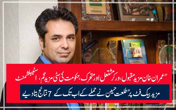 اسلام آباد : اینکر پرسن سید طلعت حسین کا کہنا ہے کہ پاکستان تحریک انصاف (پی ٹی آئی) کے چیئرمین عمران خان پر قاتلانہ حملے کے اب تک7 نتائج سامنے آئے ہیں۔ اپنے ایک ٹویٹ میں طلعت حسین نے کہا کہ اس حملے کے بعد عمران خان مزید مقبول ہوگئے ہیں، ان کے کارکن مزید متحرک اور مشتعل ہوگئے ہیں، عمران پرست چینلز اور وی لاگرز کی چاندی ہوگئی ہے۔ طلعت حسین کے مطابق اس حملے کے بعد حکومت کی سٹی مزید گم، اسٹیبلشمنٹ مزید بیک فٹ پر چلی گئی اور فوج اور آئی ایس آئی کے خلاف بیانیہ تیز ہوگیا ہے۔ اس حملے کا ساتواں نتیجہ یہ ہے کہ ملک مزید عدم استحکام کا شکار ہوگیا ہے۔