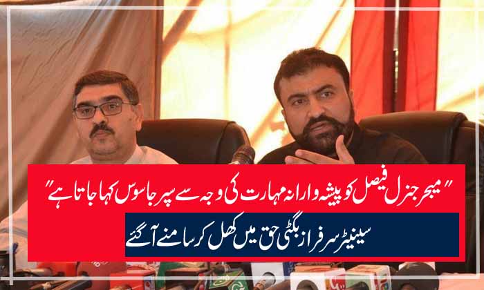 جو ڈی جی آئی ایس آئی کے بعد کور آف ملٹری انٹیلی جنس کے کیریئر آفیسر میں سب سے اہم کور ہے۔ انٹیلی جنس میں اپنی اسائنمنٹ کے دوران وہ سندھ اور بلوچستان میں دہشت گردوں کے خلاف اہم کردار ادا کر رہے تھے۔ میں بحیثیت وزیر داخلہ بلوچستان کے اپنے دور میں ان کے کچھ کاموں سے ذاتی طور پر واقف ہوں۔ ان کے بہترین اور پیشہ ورانہ کام کی وجہ سے انہیں سپر جاسوس کہا جاتا تھا۔ سینیٹر سرفراز بگٹی نے کہا کہ بدقسمتی سے میرے ساتھی سینیٹر اعظم سواتی اور چیئرمین پی ٹی آئی عمران خان اور پی ٹی آئی کی دیگر قیادت نے میجر جنرل فیصل نصیر کے خلاف معمولی سیاسی فائدے کے لیے بدنیتی پر مبنی بے بنیاد مہم شروع کر رکھی ہے۔ یہ مہم دراصل ہمارے دشمن بھارت کو فائدہ پہنچارہی ہے۔ انہوں نے اپیل کرتے ہوئے کہا کہ برائے مہربانی احتجاج اور سیاست کریں لیکن ریاست پاکستان کے لیے دن رات محنت کرنے والے اپنے ہی فرزند کے خلاف زہر پھیلانے سے پہلے دو بار سوچیں ، جنرل فیصل نصیر ایک سجے ہوئے ہیرو ہیں، براہ کرم اپنے سیاسی غصے کو آپ غلط سمت میں نہ جانے دیں۔