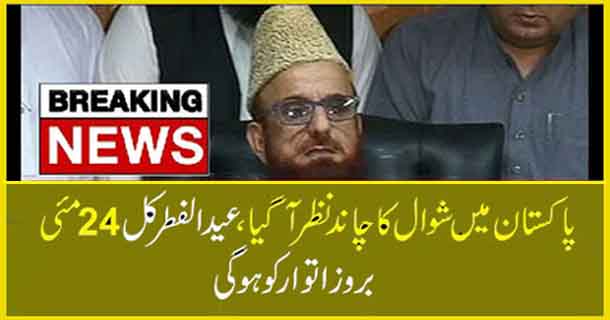 ملک بھر میں ڈویژنل اور زونل رویت کمیٹیوں کو کہیں سے بھی چاند کی شہادت نہیں ملی۔ لیکن پسنی، چمن اور جیوانی کے مختلف علاقوں میں چاند دیکھنے کی شہادتیں موصول ہوئیں۔ زونل رویت ہلال کمیٹی پنجاب کو بھی لاہور سمیت پنجاب بھر میں چاند نظر آنے کی کوئی شہادت موصول نہیں ہوئی۔ لیکن مرکزی رویت ہلال کمیٹی نے ملک بھر میں عید الفطر اتوار 24 مئی کو مذہبی جوش وجذبے کے ساتھ منانے کا اعلان کردیا ہے۔ چیئرمین مرکزی رویت ہلال کمیٹی مفتی منیب الرحمان نے پریس کانفرنس میں اعلان کیا کہ پاکستان میں مطلع صاف تھا، چمن اور پسنی میں چاند نظر آیا، جس کے باعث کل 24 مئی بروز اتوار کو عیدالفطر منانے کا فیصلہ کیا گیا۔ انہوں نے کہا کہ شوال کے چاند کا فیصلہ کرنے کیلئے آج مرکزی رویت ہلال کمیٹی کا اجلاس منعقد ہوا،اجلاس میں چاند دیکھنے کی شہادتیں موصول ہوئیں۔ پاکستان میں بیشتر مقامات پر مطلع صاف تھا، چمن میں رویت ہلال کمیٹی کے ممبر نے بتایا اعتکاف میں بیٹھے 15 افراد نے چاند دیکھا۔ پسنی میں چاند دیکھنے کی چاند شہادت موصول ہوئی، اسی طرح متعدد مقامات سے چاند دیکھنے کی شہادتیں موصول ہوئیں۔